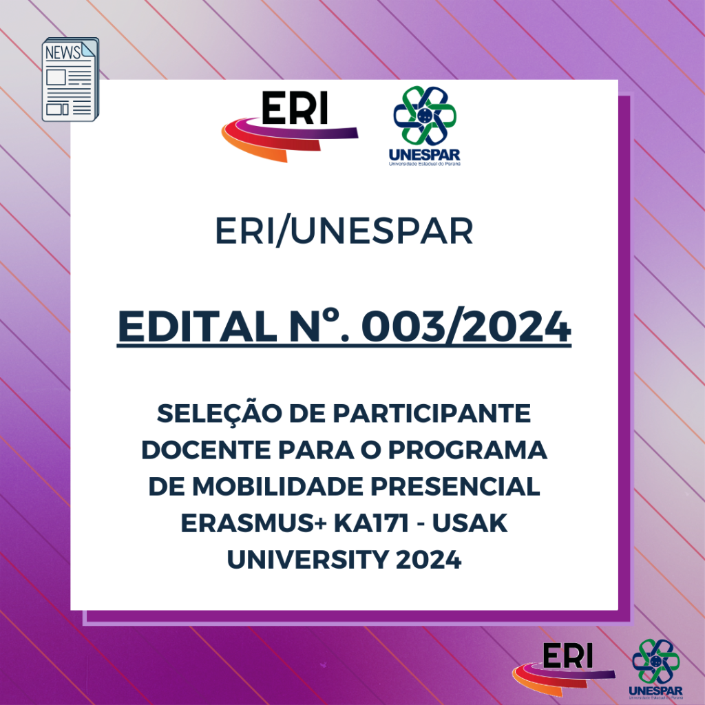 Edital N° 003/2024 - ERI/Unespar - Seleção de Participante Docente para o Programa de Mobilidade Presencial ERASMUS+ KA171 – Usak University 2024-2025