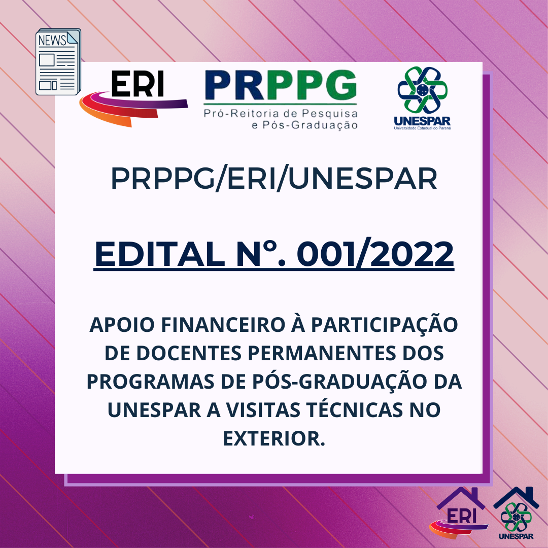 Edital Nº. 001/2022 - PRPPG/ERI/UNESPAR - APOIO FINANCEIRO À PARTICIPAÇÃO DE DOCENTES PERMANENTES DOS PROGRAMAS DE PÓS-GRADUAÇÃO DA UNESPAR A VISITAS TÉCNICAS NO EXTERIOR.