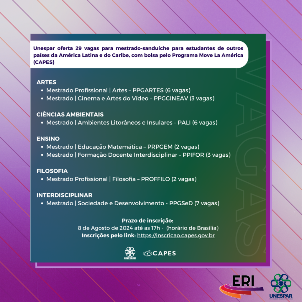 Unespar oferta 29 vagas para mestrado-sanduíche para estudantes de outros países da América Latina e do Caribe, com bolsa pelo Programa Move La América (CAPES)