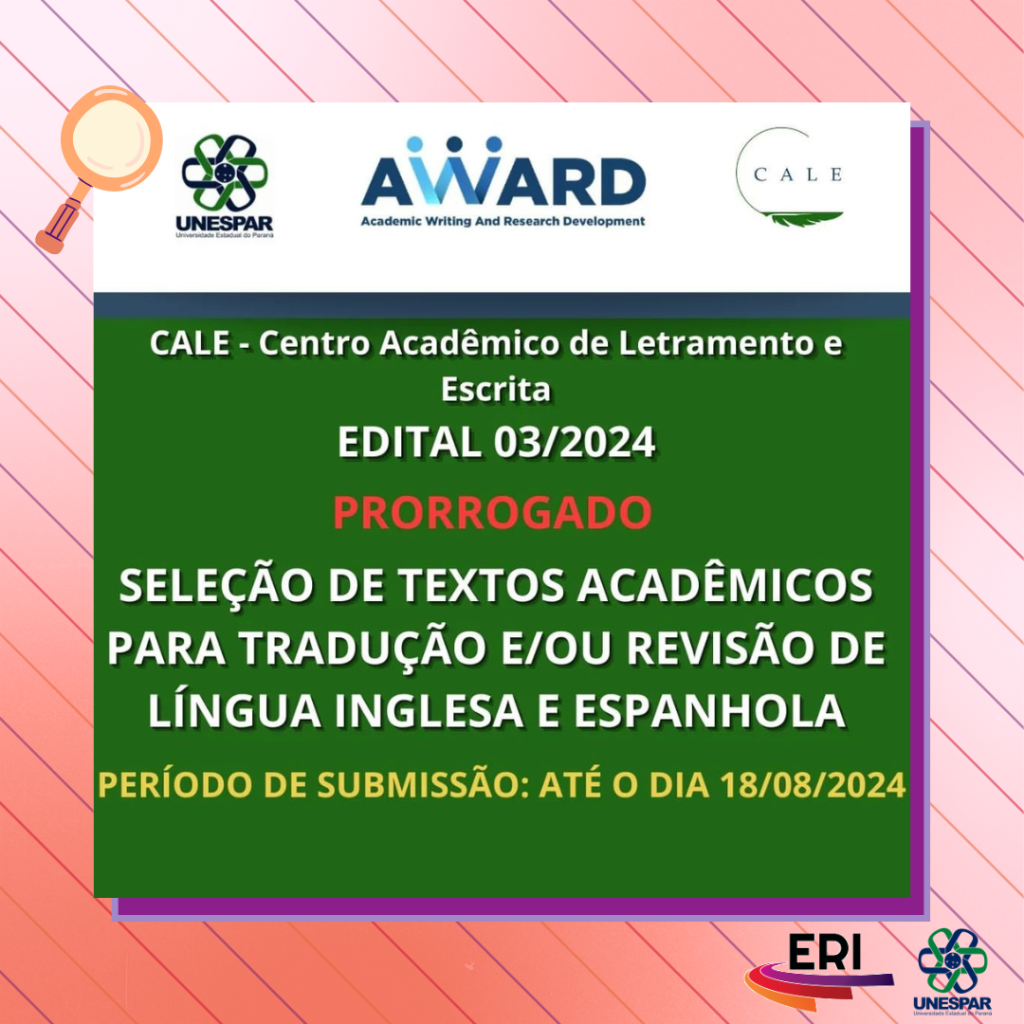 Edital 03/2024 para Seleção de Artigos Acadêmicos para Tradução e/ou Revisão de Língua Inglesa e Espanhola do CALE - AWARD prorrogado até 18/08