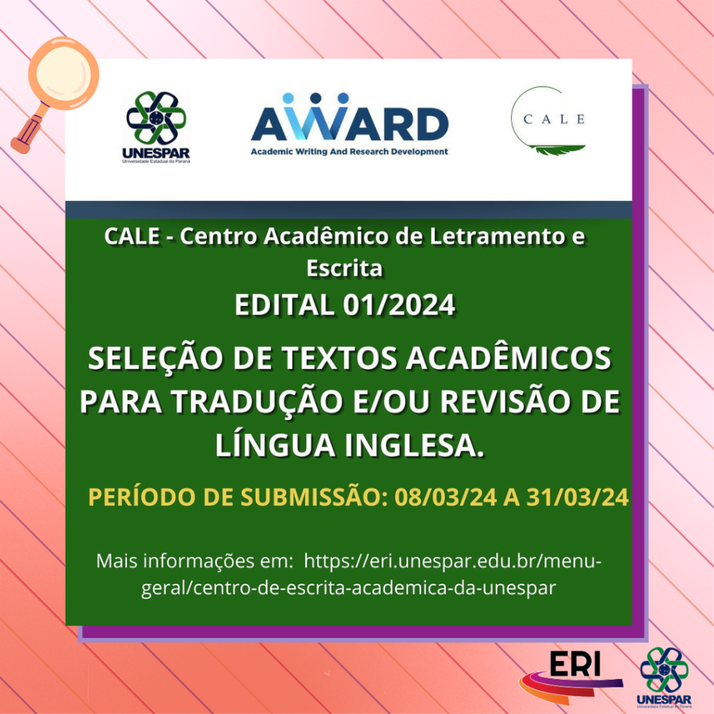 Edital 01/2024 para Seleção de Artigos Acadêmicos para Tradução e/ou Revisão de Língua Inglesa do CALE - AWARD até 31/03
