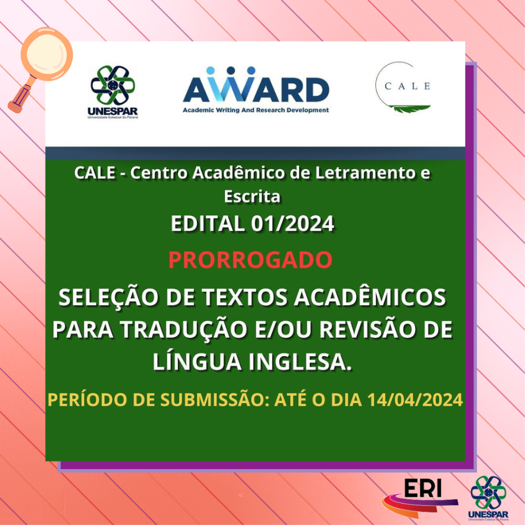 Edital 01/2024 para Seleção de Artigos Acadêmicos para Tradução e/ou Revisão de Língua Inglesa do CALE - AWARD prorrogado até 14/04
