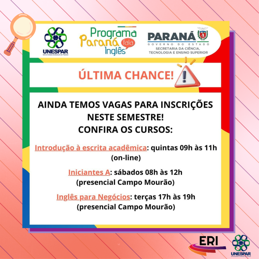 Vagas remanescentes em turmas do 1º semestre de 2024 do Programa Paraná Fala Inglês (PFI) da Unespar